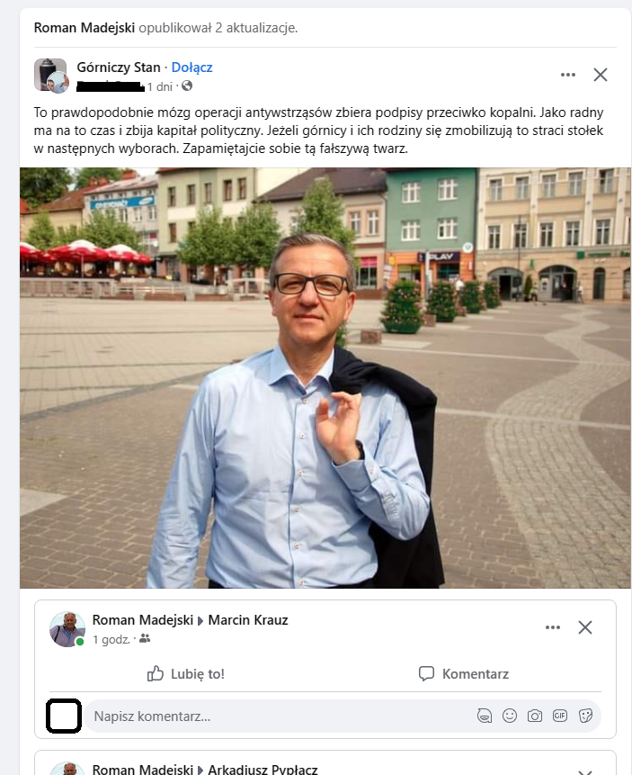 Radny Madejski, który jest równocześnie górniczym emerytem, opublikował wpis na profilu swojego klubowego kolegi z Rady Miejskiej Marcina Krauza. Od września 2022 roku ta dwójka oraz radny Piotr Potocki tworzą klub „Porozumienie i Współpraca (wcześniej radny Roman Madejski opuścił klub Prawa i Sprawiedliwości, z którego startował do Rady Miejskiej). Przesłał go również na prywatny profil Przewodniczącego Związku Międzygminnego „Gospodarka Komunalna” Arkadiusza Pypłacza, którego Madejski jest w ZMGK zastępcą. Obydwa udostępnienia były publicznie widoczne dla sporego grona znajomych, w tym licznych mieszkańców, obserwujących prywatne profile szefa ZMGK i radnego. Obecnie wpis widnieje jedynie na profilu radnego Krauza.