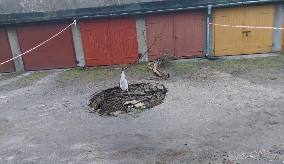 To, co spędza sen z powiek mieszkańcom Trzebini, dotarło do Chrzanowa. W mieście powstało zapadlisko na osiedlu Rospontowa. O zdarzeniu z poczatku lutego poinformowała przewodnicząca rady osiedla Jarosława Tobiasz. Jak relacjonuje nasza Czytelniczka, dziura w drodze między zabytkowymi budynkami mieszkalnymi a garażami, około